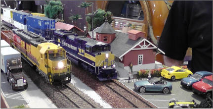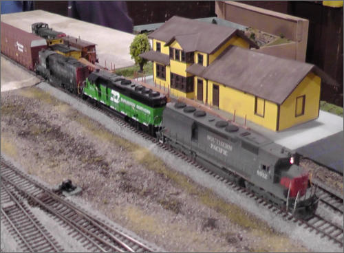 Janek’s fantasy scheme SPSF DD40 rolls past Steve’s intermodal train which